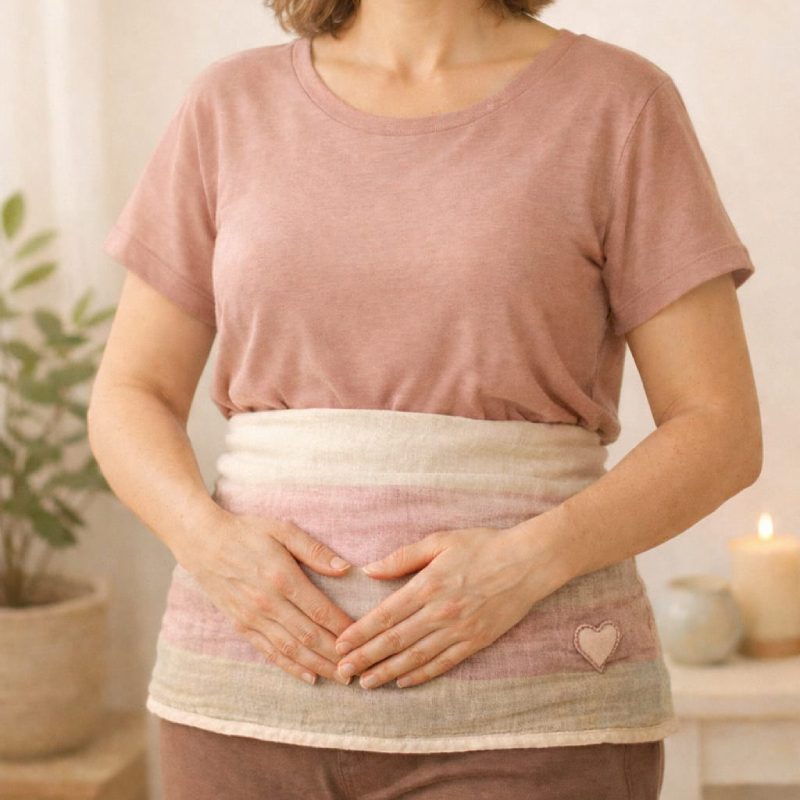 Faixa uterina inspirada en la tradició japonesa, creada com una eina de cura femenina per escalfar, protegir i reconnectar amb el centre del cos.